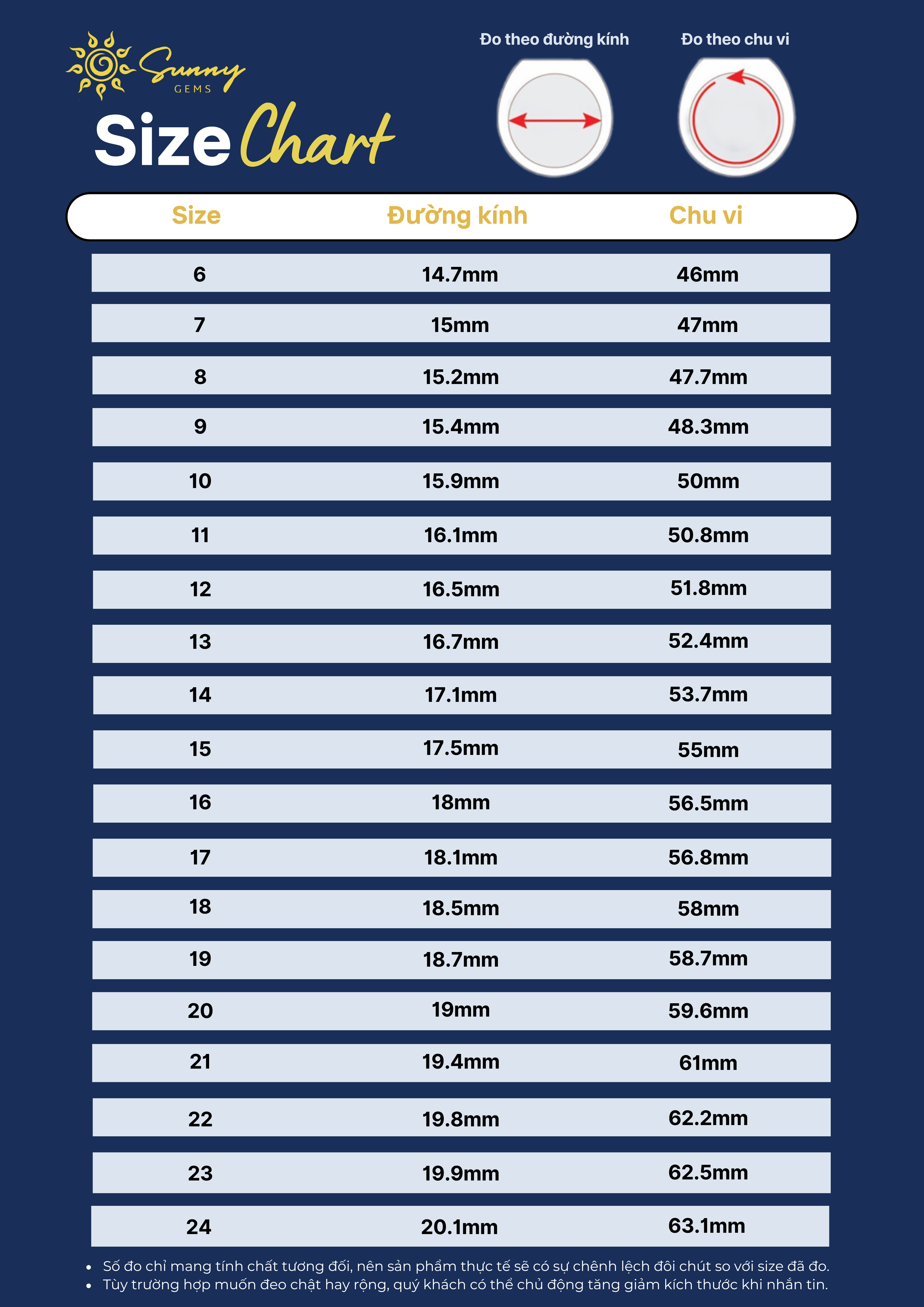 Xử Lý Lỗi Sản Phẩm hoặc Sai Kích Thước: Trong trường hợp sản phẩm bị lỗi hoặc không đúng kích thước tay ngay khi mở kiện hàng, Quý khách vui lòng liên hệ với Sunny Gems qua kênh Zalo của cửa hàng để được hỗ trợ.