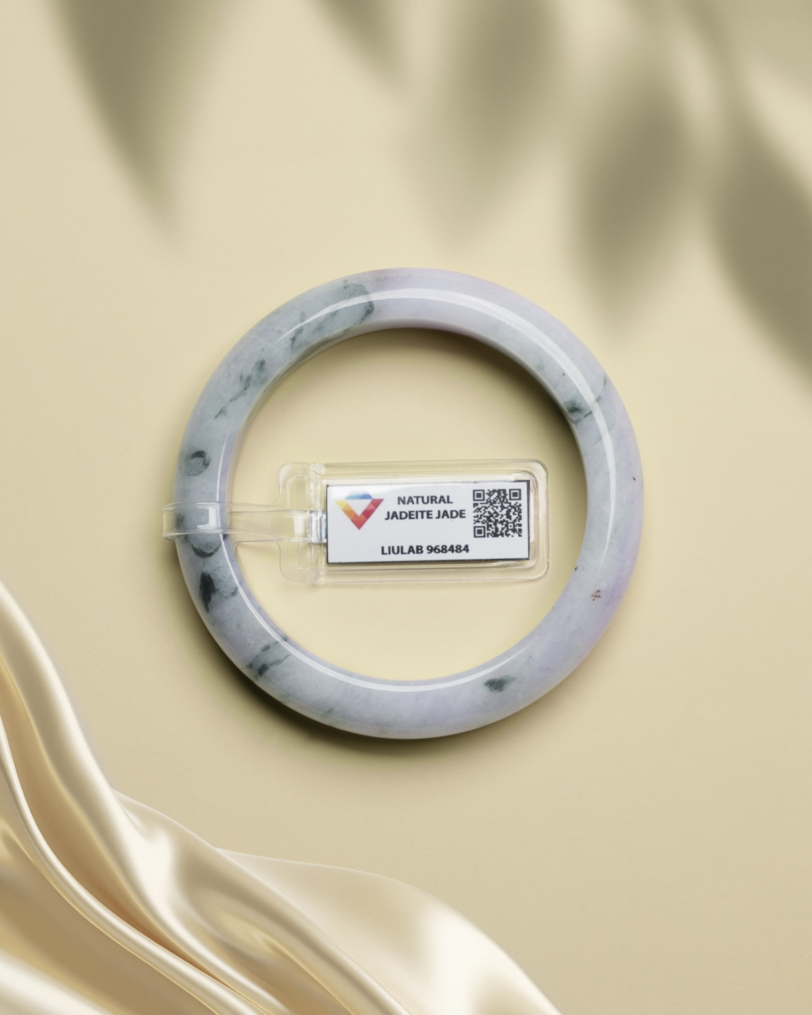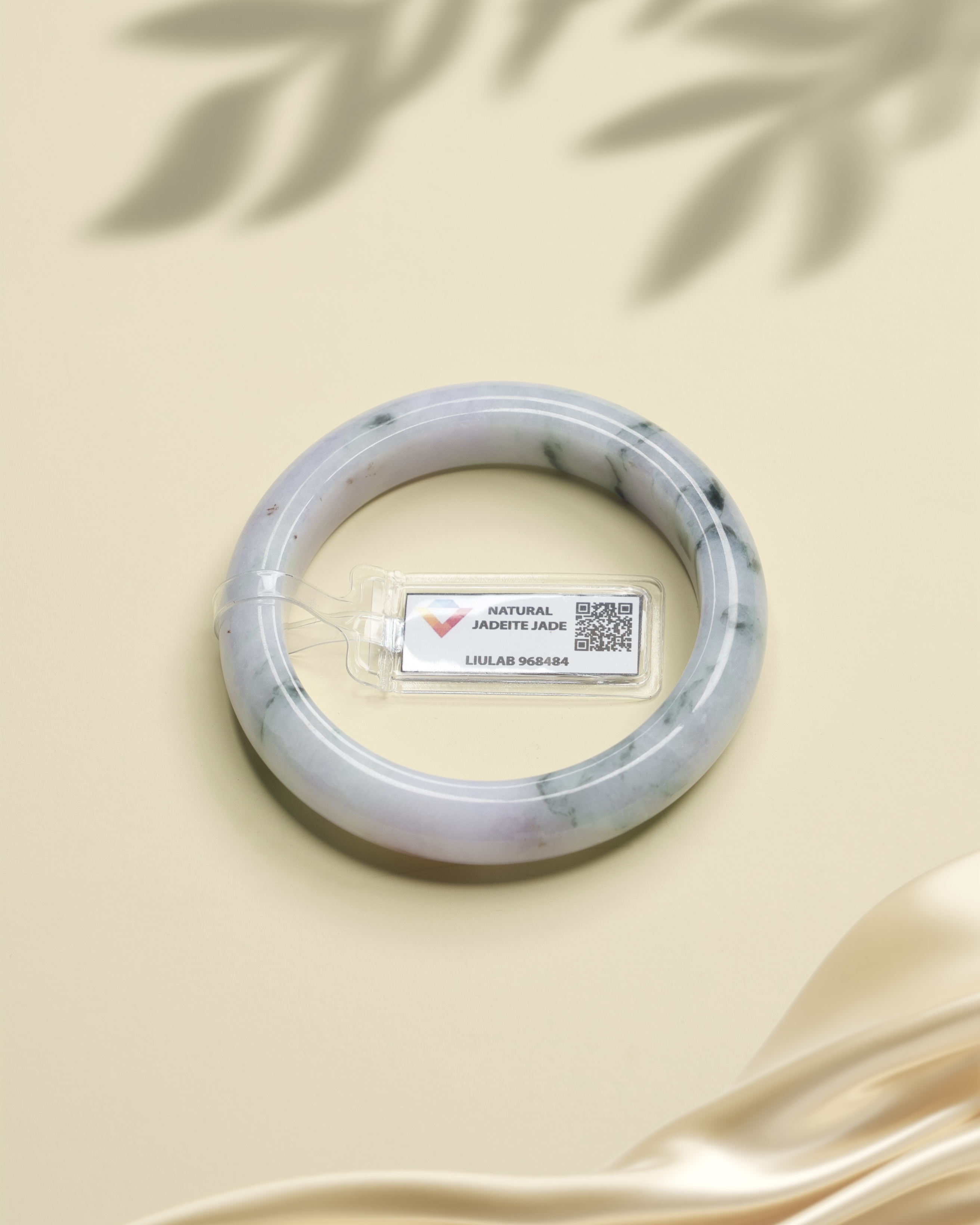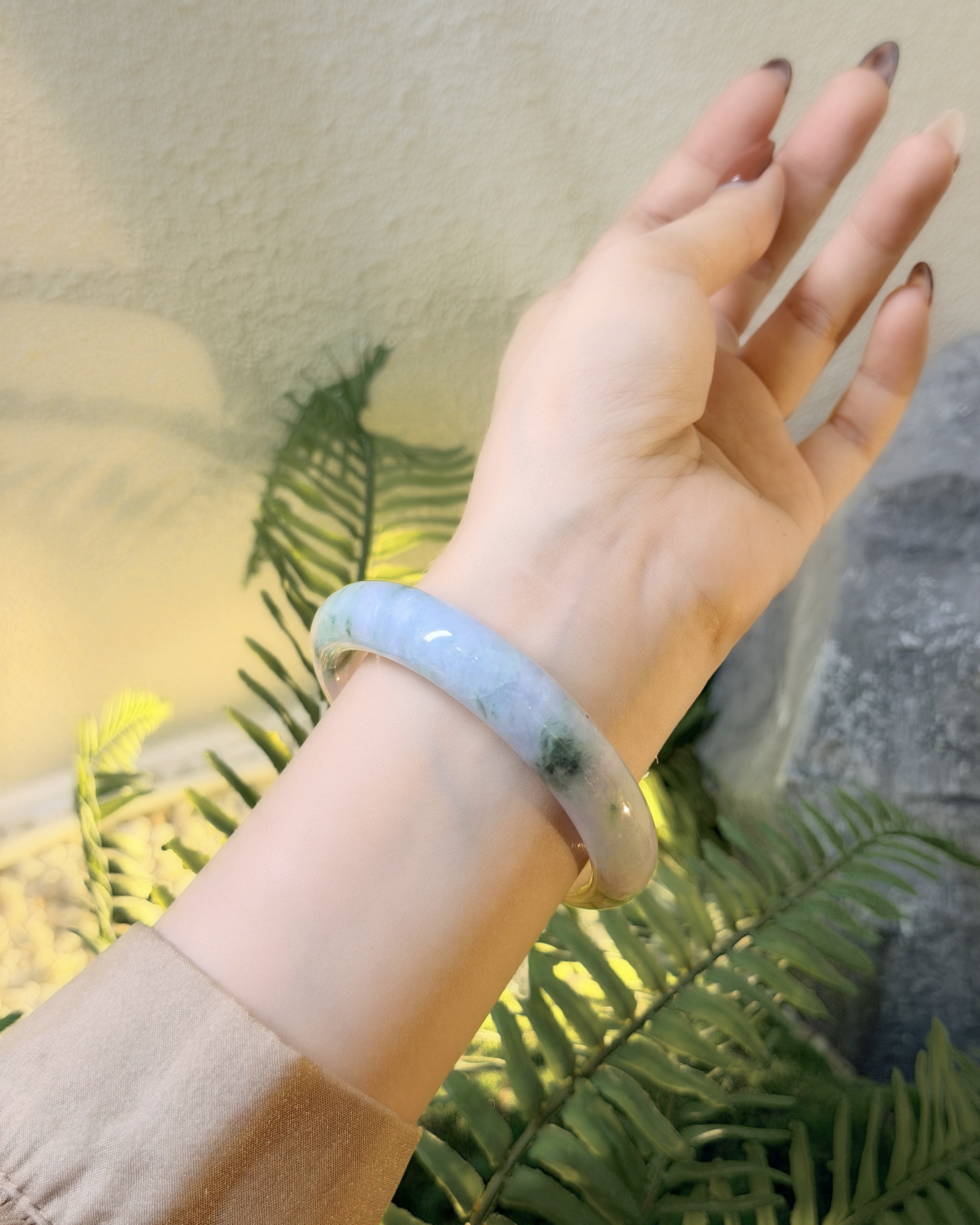 Trên nền ngọc trong, những dải màu tím lavender, trắng sữa và xanh non loang nhẹ vào nhau, tạo nên những đường vân mềm mại, uyển chuyển. Mỗi chiếc vòng là một bức tranh riêng biệt, không bao giờ có phiên bản thứ hai. Ánh sáng xuyên qua chất ngọc, làm nổi bật những dải màu đang trôi nổi, tạo nên một vẻ đẹp vừa hư vừa thực, đầy cuốn hút.